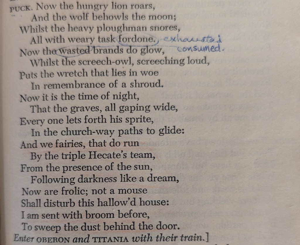 And we fairies, that do run By the triple Hecate’s team, From the presence of the sun, Following darkness like a dream, Now are frolic: not a mouse Shall disturb this hallow’d house: I am sent with broom before, To sweep the dust behind the door. (V. i.)