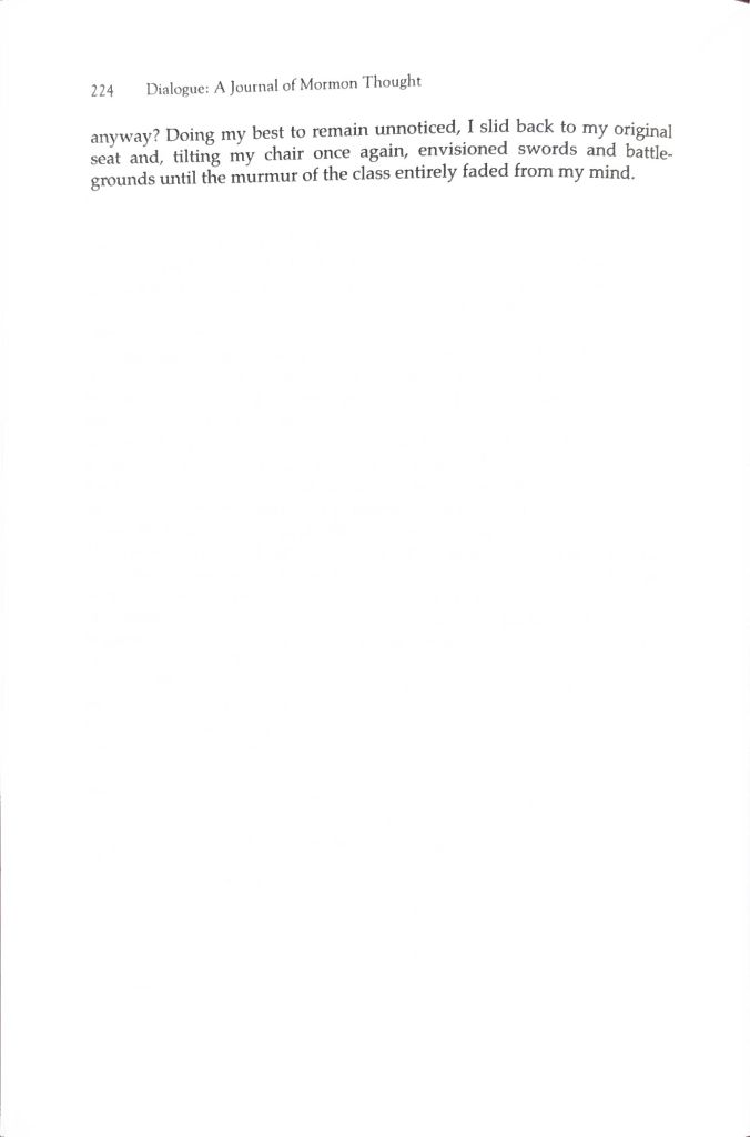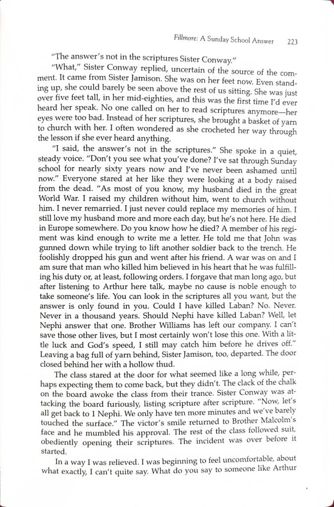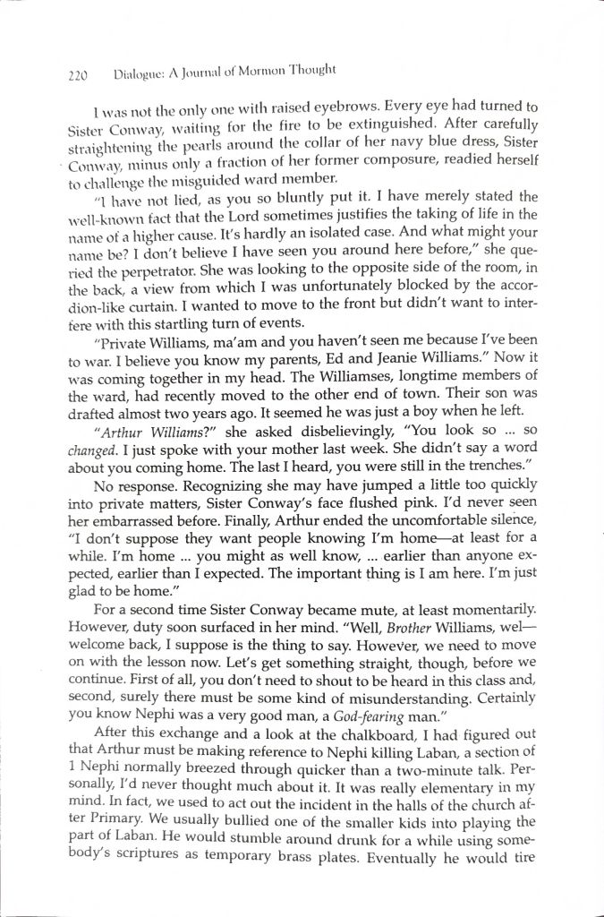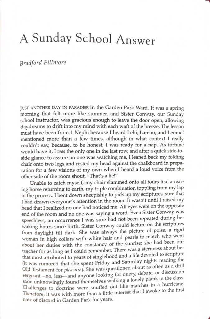 So I went to work on a new short story set in a Sunday School class, in which a class member challenges the instructor’s interpretation of scripture. That story got published as “A Sunday School Answer.” Then I ventured into uncharted territory with a poem about members of an LDS singles’ ward in which members in the foyer feel both literally and figuratively separated from the congregation in the chapel. I wrote the first draft of that poem during the meeting, in the foyer of a singles’ ward in Holliday, UT, while I was ward-hopping in search of love and friendship.