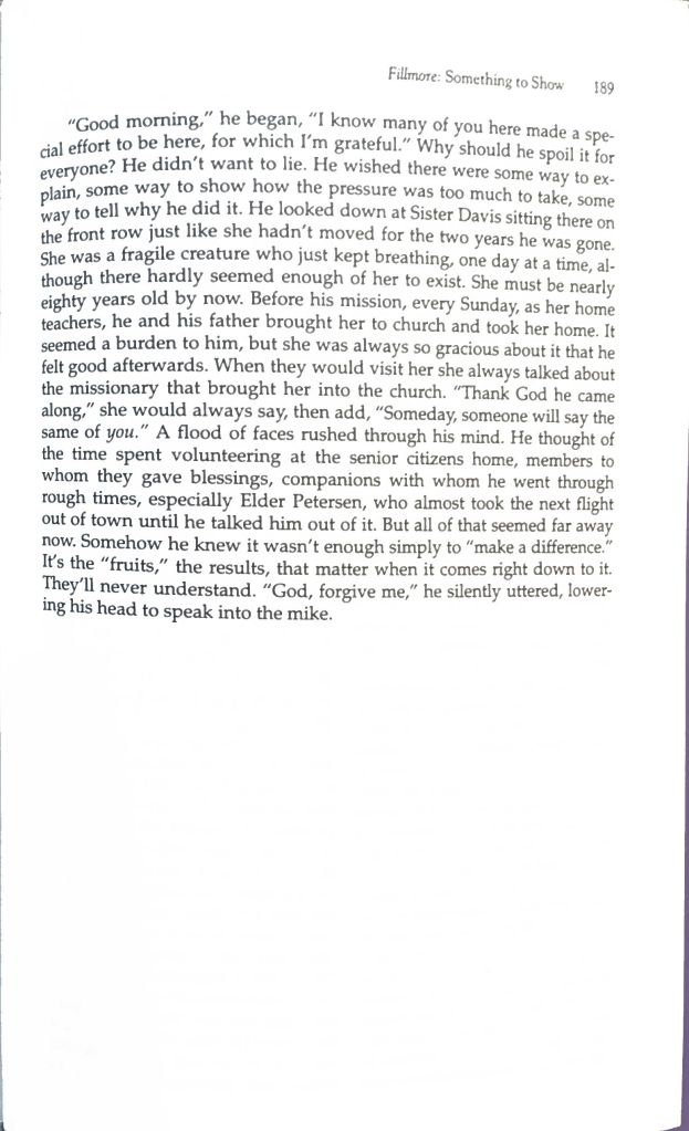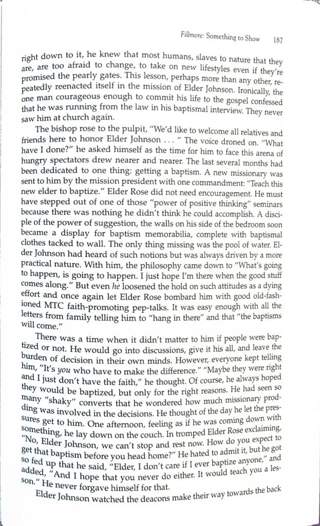 The class syllabus required all of us to write something in each of the creative writing genres: fiction, drama, and poetry. I decided to start by writing a short story, but I was clueless about where to begin. My mind started playing inferiority tricks on me again, and I became discouraged as I compared myself to Joyce, Hemingway, Bradbury, O’Connor, and the like. It was the night before the deadline, and in an act of either inspiration or desperation, I decided to write about a young LDS missionary. I decided to take the advice of Ernest Hemingway and to “write what you know.” Having just served a mission in Pennsylvania, I knew all of the ins and outs of missionary work. I knew the joys, the sorrows, and the intense desire to be successful and bring converts into the church. I started by asking a “what if” question. This was the question: What if a missionary felt so much pressure to be successful that he started to tell lies to the people back home about his great “successes”? I set the story at the young Elder’s homecoming sacrament meeting. The dramatic question of the story was “would the young man face his demons, or let the charade continue?” Once I got started, the story really wrote itself.