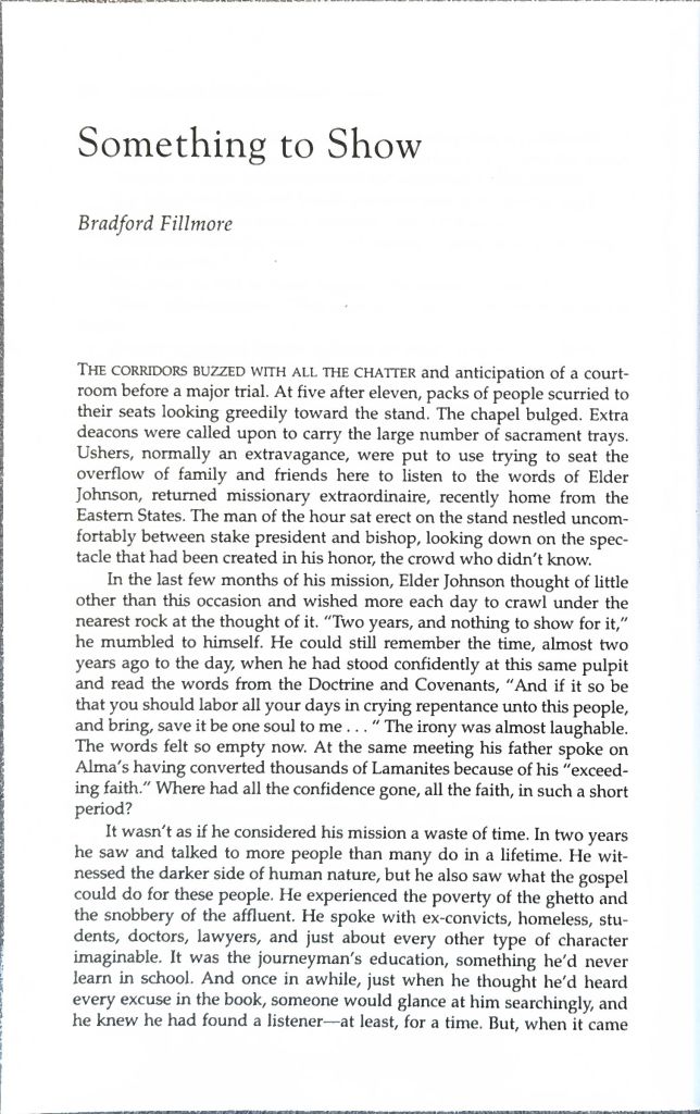 I knew he was right about the ending, but I was excited that he thought I had something publishable. I rewrote the ending and sent my story off, crossing my fingers that I could become a published writer for the first time. A few weeks later, I received a letter from the editor of Dialogue, saying he would like to publish my story. I felt like I was walking on air all day. I kept running the words through my mind, “Brad Fillmore, published writer.” Ideas for more stories started rolling through my brain. After a few months, the editor of Dialogue sent me several copies of the journal with MY STORY IN IT. I looked through the table of contents and found my story, “Something to Show,” by Bradford Fillmore. I decided to go with the longer version of my name. It sounded more authorial to me.