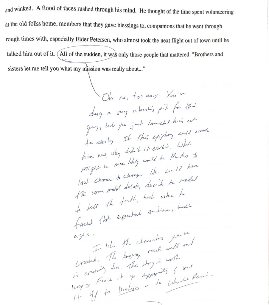 Dr. Crowe liked the story but called me out on the ending: “Oh no, too easy. You’ve dug a very interesting pit for this guy, but you just launched him out too easily. If this epiphany could smack him now, why didn’t it earlier? What might really be more likely would be the loss of last chance to change. He could have the same mental debate, decide he needed to tell the truth, but when he faced the expectant audience, buckle again. I like the characters you’ve created. The language reads well and is creatively done. This story is worth keeping . Finish it up and send it off to Dialogue or to Wasatch Review.“